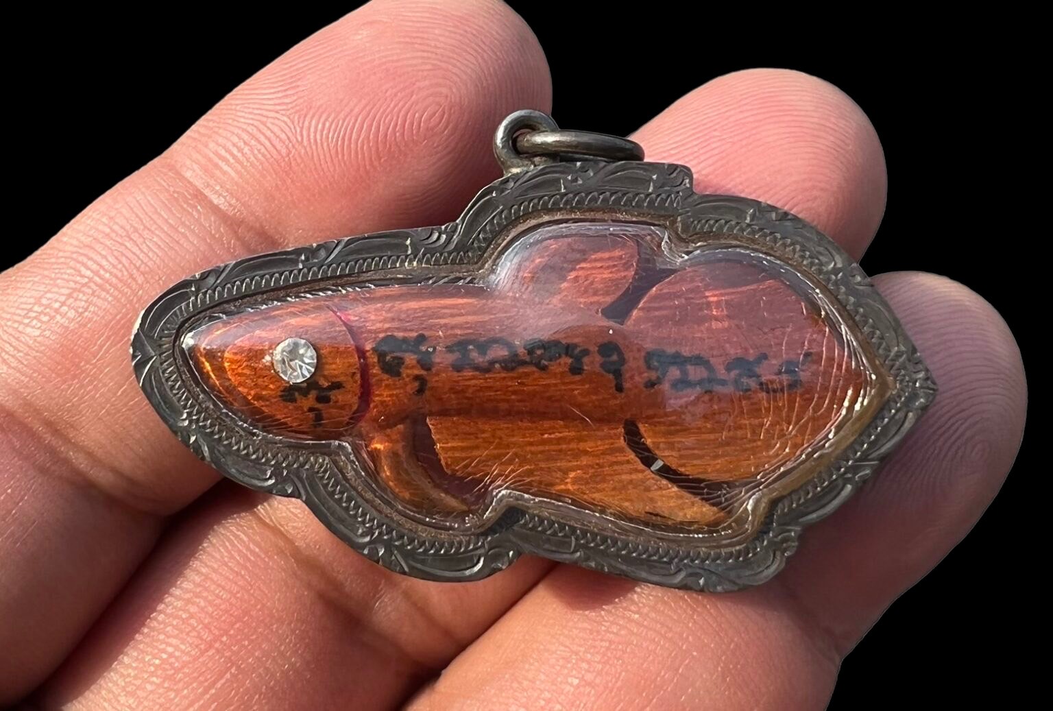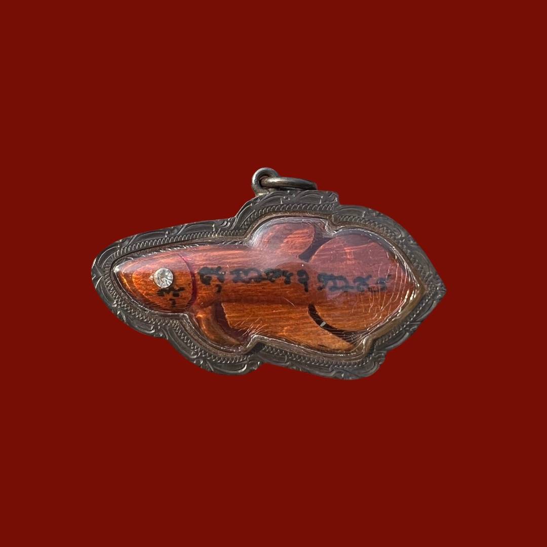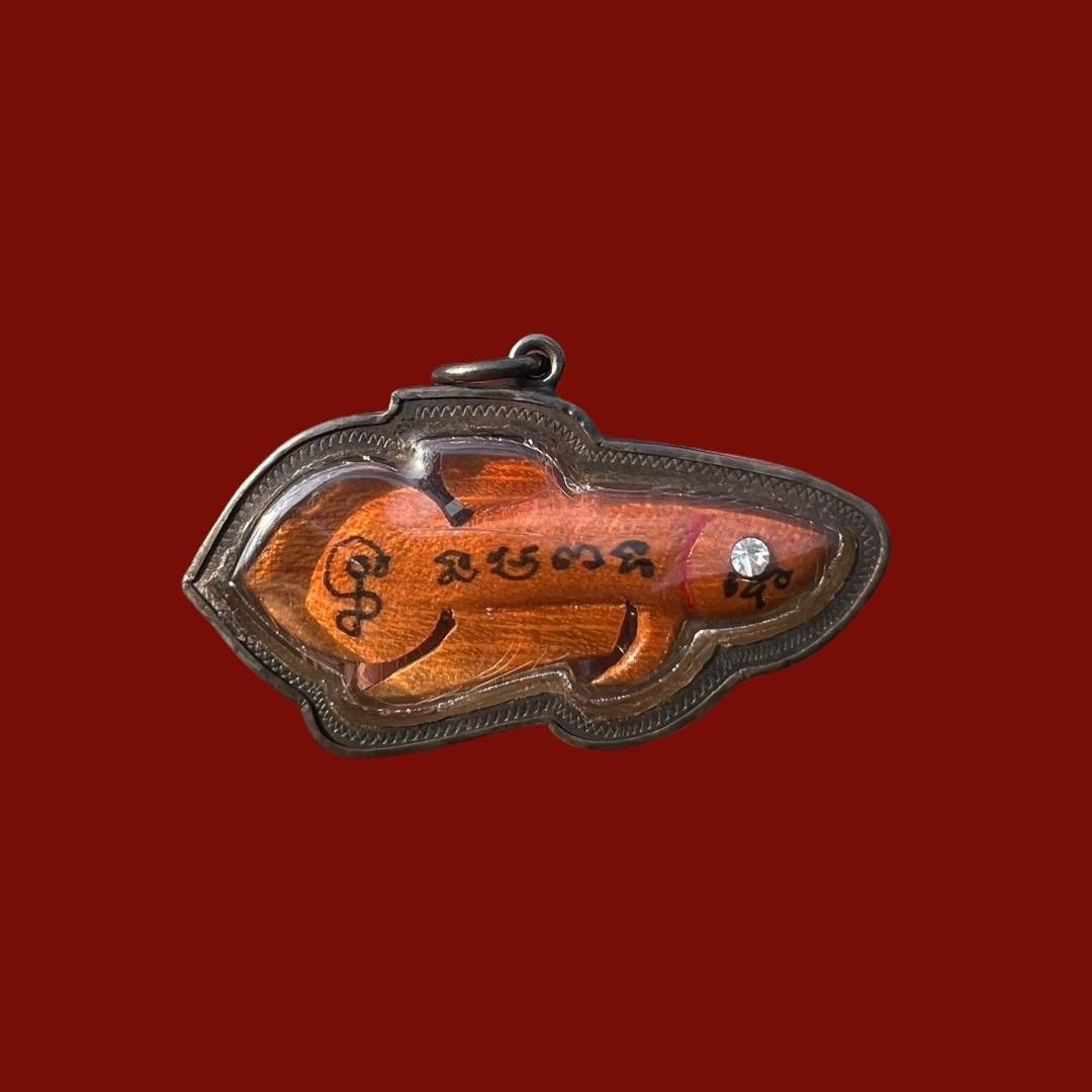 Fighting fish sarapadnuek lp nuam wat phosricharoen suphanburi jackfruit wood carved eye with diamond . with silver case from temple