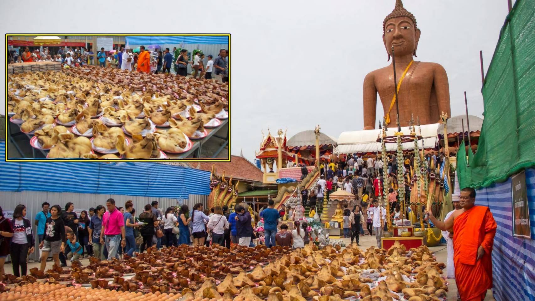 Lp somwang is big buddha marnwichai pose . Made from brick and cement cover with mosaic tiles . First made by lp phut sunataro of wat klangbangphra (now his body not rotten , located at glass coffin in wat klangbangphra) Made in B.E.2524 by occasion of angel and sacred things . base size 15 meters 39 centimeters , height 30 meters 39 centimeters . Inside have mass and metals . Blessed with summon buddha 9 inch total 99 pcs put inside big buddha for prosperity for prayer . Originally called lp yai . Later people pray and successful . so called in lp somwang because which anything success . So they take item to make a vow . Told that if wishing in lover , family if success need to make a vow with pig head . If wishing in work , foward in career , fortune . If success need to make a vow with chicken eggs