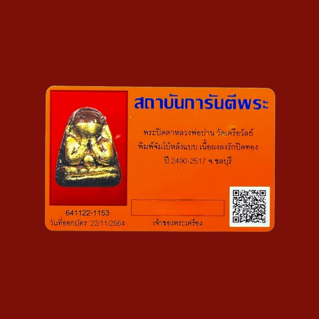 Phra pidta lp parn wat kruewan B.E.2490(early age) pim jumbo powder with rak and gold with G-pra card