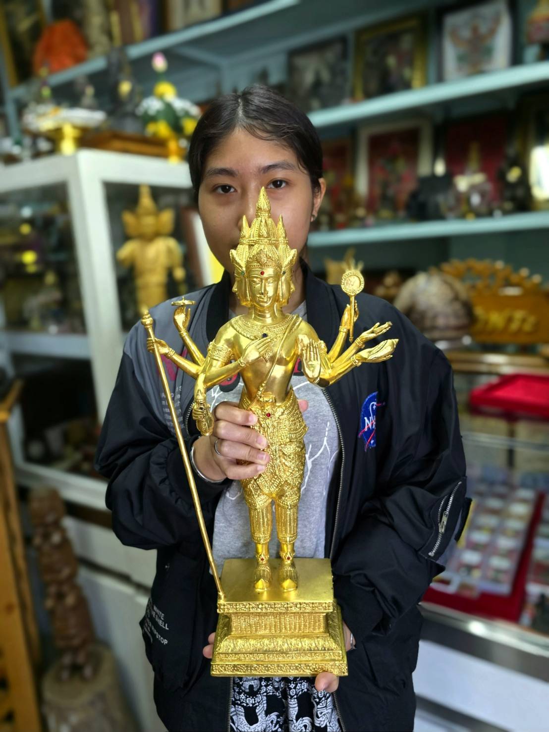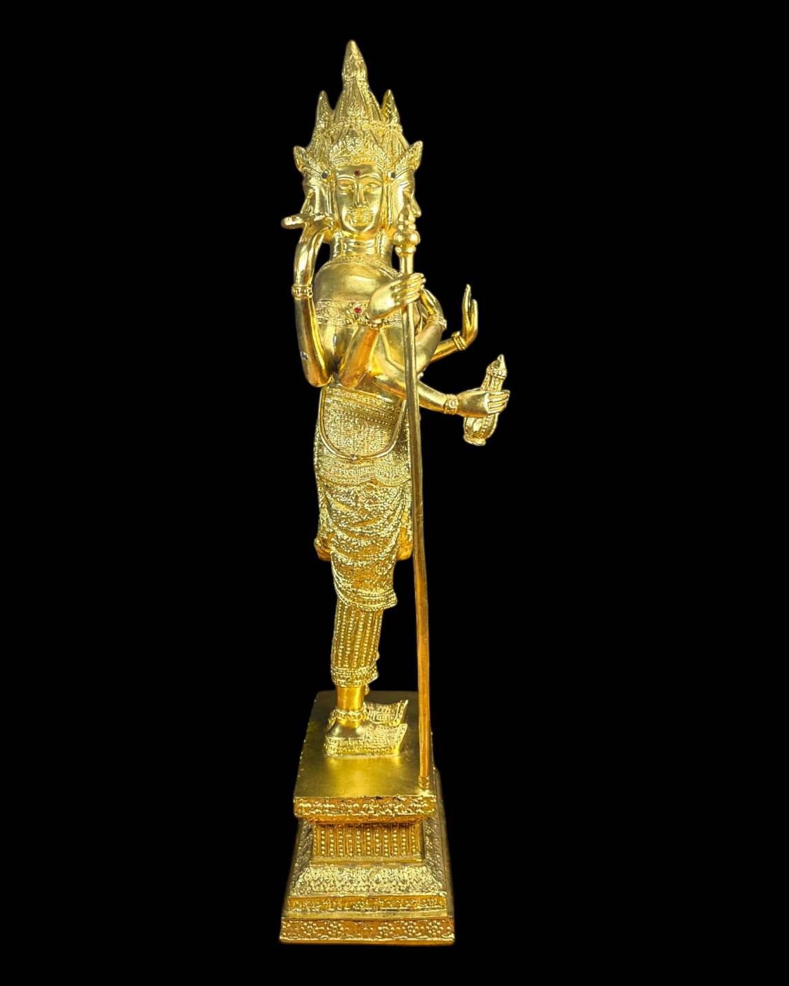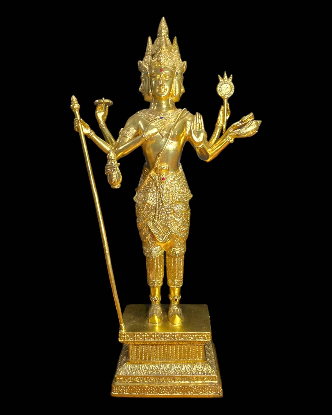 องค์ที่นำมาลงนี้เป็นพระพรหมปางยืนซึ่งเป็นปางที่หายากมากๆมีอายุประมาณ40-50ปี มีขนาดค่อนข้างใหญ่สูงถึง20นิ้ว หนักถึง5กิโล หล่อด้วยทองผสมลงรักปิดทองคำแท้ทั้งองค์และประดับด้วยพลอยแท้ หล่อได้ละเอียดงดงามมากๆพระพรหมยืนเชื่อกันว่าถ้าบูชาใว้ในบริษัทห้างร้านจะสื่อถึงความมั่นคง ยั่งยืน เจริญก้าวหน้าด้วยโภคทรัพย์นานาประการ