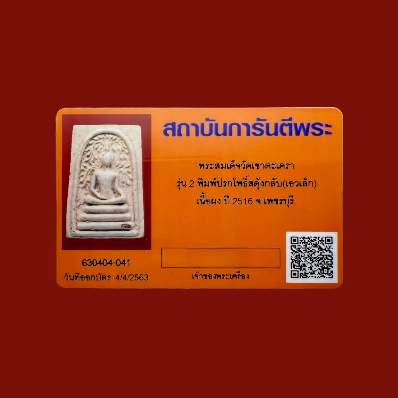Lp wat khaotakrao is one of sacred buddha flow from northern of thailand flow together 5 buddha that is lp sothorn , lp wat banlaem , lp toh wat bangpleeyai , lp wat raikhing and lp wat khaotakrao called 5 brother buddha . that now in thai each is top sacred buddha of thailand . and lp wat khaotakrao flow until reach wat khaotakrao phetchaburi , villager get it put in wat khaotakrao , villager in phetchaburi and nearby come to pray and wish from lp wat khaotakrao got success as wish in all . so how famous of lp wat khaotakrao is flow whole thailand , Somdej wat khaotakrao 2nd gen B.E.2516 after lp samran make somdej wat khaotakrao 1st gen B.E.2513 user have experience in many way so who faith in lp wat khaotakrao have wanted . lp samran use mass that made somdej 1st gen like broken somdej wat rakhang , broken phra kru and powder of great monk made again in B.E.2516 by made and blessed same as 1st gen all . so somdej wat khaotakrao 2nd gen have power same as 1st gen and can use for it . but cheaper . this one is pim prokpho sadungklab pim lek that find less . this one is full of mass . with g pra card that high standard . phra pim prokpho sadungklab of wat khaotakrao if 1st or 2nd gen is most famous . and have power in mettamahaniyom , safety and selling . and have special power that is reversed bad to good . so good to use