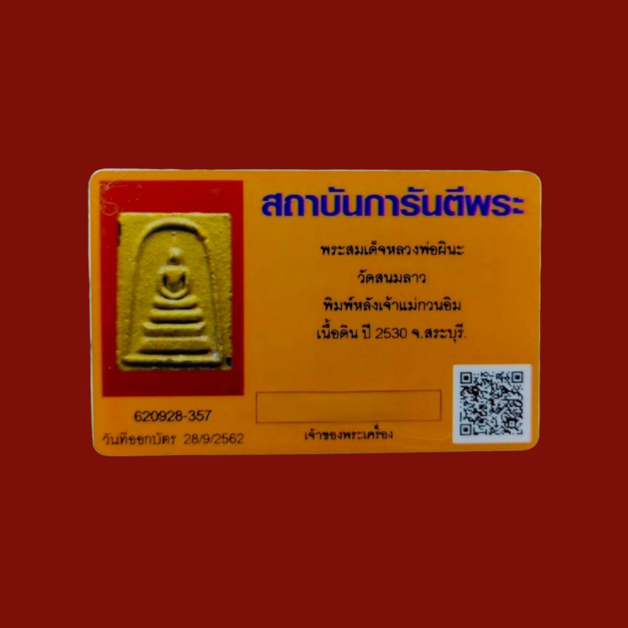 Phra somdej back chaomae guanim lp phina wat sanomlao saraburi B.E.2530 baked clay mixed curse ore with G-pra card
