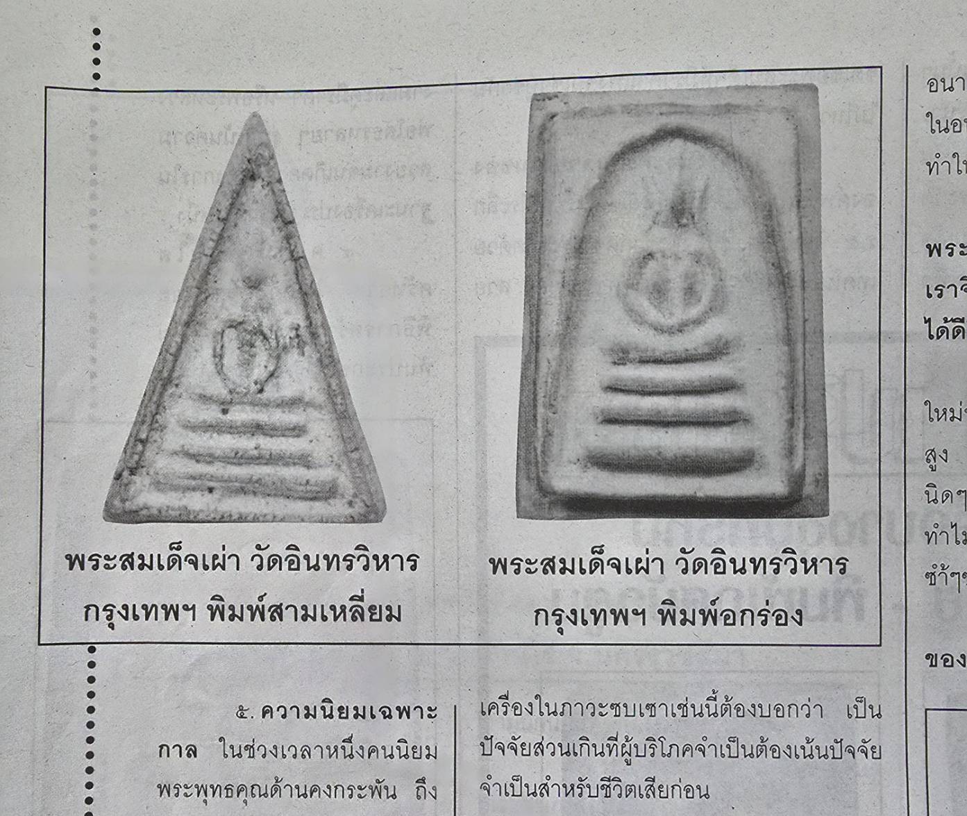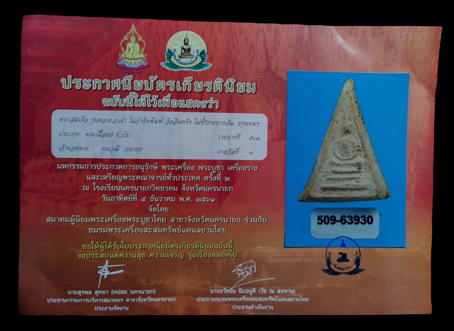Somdej phao wat intraviharn B.E.2495 is one of somdej that famous long time by pol.gen.phao sriyanon (director.gen. that time) is made and give pol.maj.gen.nueang arkubutr progress made phra pim somdej for made money made shrine of wat intrviharn . mass that made is rare all like old powder somdej phuttajarn toh that lp poo keep and broken somdej wat rakhang , tabai powder phra kring and chinnarat indojeen of wat sutat , powder lp derm and great mon in that time . and great monk that blessed is famous in that time all . like lp sod wat paknam , lp jong wat natangnork , lp nak wat rakhang , lp phuek wat kingkaew , lp rung wat thakrabue , lp chuang bangphraektai and more . its amulet that good in mass and great monk that blessed . this one is triangle . with 3rd in comp at nakhonnayok wittayakom school in 9/12/2561 by thai amulet club (samakhom) power that told can use for expensive somdej wat rakhang .