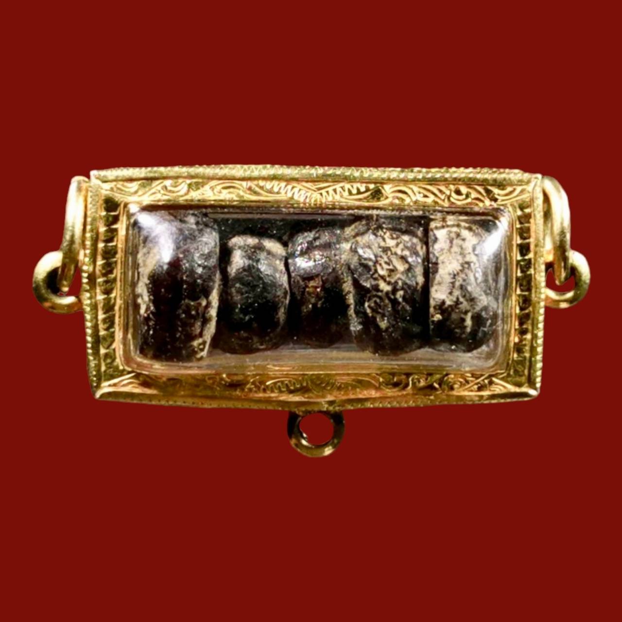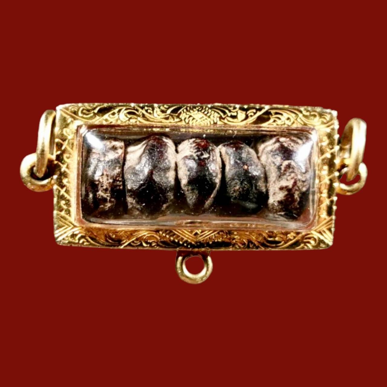 Lp iam pathomnam of wat saparnsoong nonthaburi is no.1 monk of nonthaburi and top of thai . even he pass away more than 100 years . but how sacred of him still remains nowadays . like he tell before pass away that “if have anything realize my name” so now his sculpture in same size as him stay at front of church , have people faith and pray in everyday . even lp iam make pidta and takrud solol . that now price up to million . even that 2 amulet . lp iam also make other amulet like knife , prakhum , photo , yant cloth and more . but make in less amount . not like pidta and takrud . so other his amulet must see from how old and place that come . like this one that i show is medphrakhum joomrak powder that material is same as pidta . rak that older than 100 years get from trustable place . inheriting and give to each other . this one get 5 pcs with high percentage gold case make special thick . trust that can use instead of pidta that very expensive