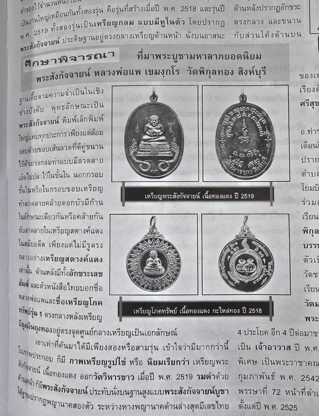 หลวงพ่อแพ วัดพิกุลทองเป็นพระเกจิอาจารย์ที่มีชื่อเสียงโด่งดังมาก มีลูกศิษย์ลูกหามากมายทั่วประเทศและยังเป็นที่รู้จักไปยังต่างแดนอีกมากมายหลายประเทศ อาทิเช่น ประเทศจีน, ฮ่องกง, สิงคโปร์, ไต้หวัน, มาเลเซียฯลฯ ด้านวิปัสสนากรรมฐานและพระเวทย์วิทยาคม หลวงพ่อแพท่านได้ฝากตัวเป็นศิษย์ของพระครูใบฎีกาเกลี้ยง วัดสุทัศนเทพวราราม กรุงเทพฯ และ หลวงปู่ศรี วัดพระปรางค์ อ.บางระจัน จ.สิงห์บุรี โดยท่านได้ศึกษาจนมีความเชี่ยวชาญชำนาญทางนี้มาก หลวงพ่อแพเริ่มสร้างวัตถุมงคลมาตั้งแต่ปี พ.ศ.2482 มีทั้งเนื้อผงและเนื้อโลหะ อาทิเช่น พระสมเด็จ พระนางพญา พระรอด พระปิดตา พระลีลาทุ่งเศรษฐี พระสิวลี พระสังกัจจายน์ พระขุนแผน พระผงรูปเหมือน นางกวัก ฯลฯ วัตถุมงคลที่จัดสร้างขึ้นทุกรุ่นของท่านนั้นปรากฏพุทธคุณสูงเป็นที่น่าอัศจรรย์ในทุกๆด้าน ได้รับความนิยมอย่างกว้างขวาง เนื่องจากมีประสบการณ์มากมายทั้งโชคลาภค้าขาย กิจการเจริญก้าวหน้า แคล้วคลาดปลอดภัยจากภยันอันตรายทั้งปวง